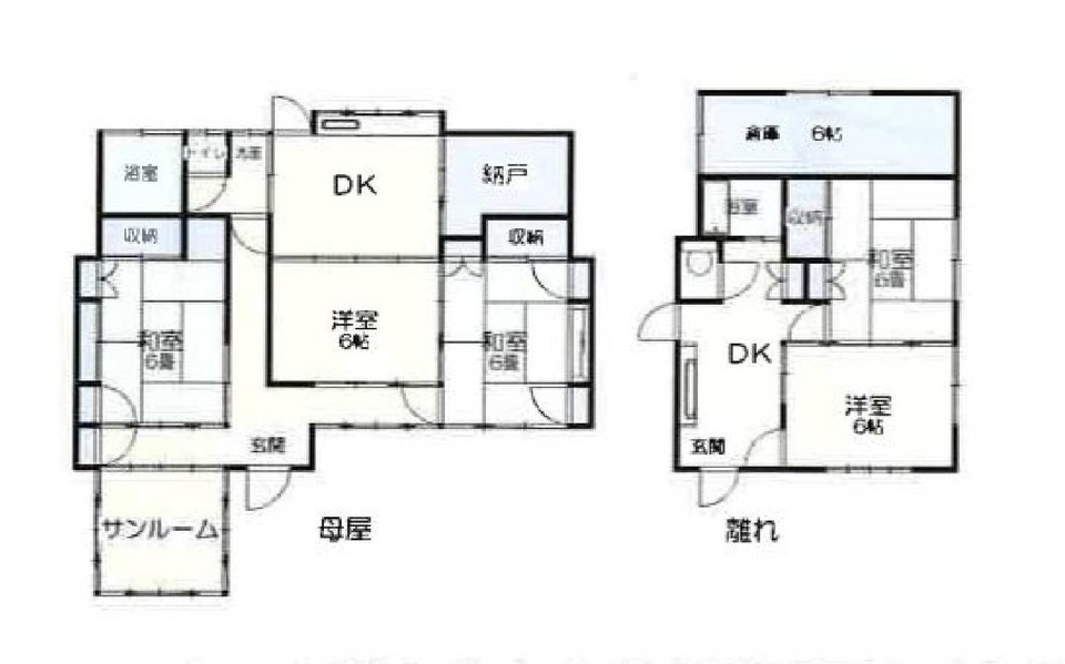 | 詳細間取り | 母屋:和室(6・6畳)・洋室(6帖)・台所・風呂・トイレ・サンルーム離れ:和室(6畳)・洋室(6帖)・台所・風呂・トイレ・倉庫