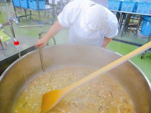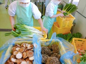 前橋tonton汁は具だくさんです。右の調理員さんはきのこを炒めています。