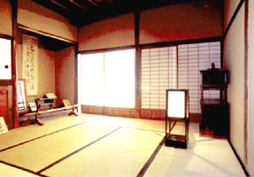 母屋の北側には玄関式台があり三畳のゲンカンを入ると、その左手に八畳のジョウダンがあります。この南に八畳のナンド、十畳のザシキ、十五畳のオカッテが並び、一番西に土間があります。