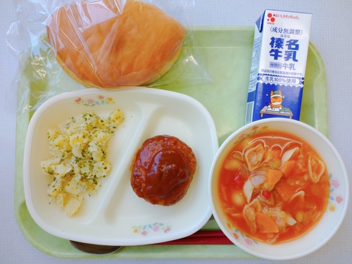最近の不安定な天候や気温差の影響からか、体調を崩している人が多いように感じます。環境の変化や気温の変化に体がついていけない「春バテ」なんてことばも耳にします。今日はパンにハンバーグをはさみ、手に持って食べるメニューです。食事の前には手を石けんできれいに洗い、手についた細菌やウイルスを体に入れないよう注意したいですね。