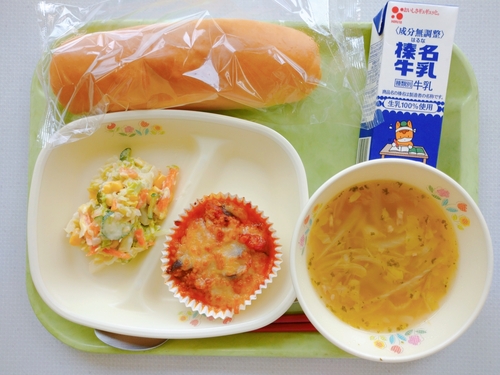 安中市のなすをたくさん使ったミートグラタンです。今朝給食センターに届いたなすは17kg、新鮮でピカピカに光ったなすを農協さんが届けてくれました。とれたての新鮮野菜をおいしさ100%のまま調理できるなんてすばらしいことです。なすの苦手な人も食べてくれたらいいな。そんな思いで作りました。スープは安中産のたまねぎがたっぷりです