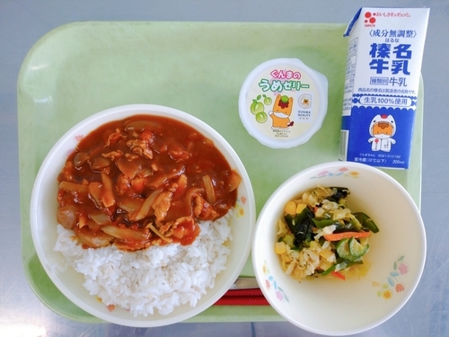 6月4日から10日まで「歯と口の健康週間」です。それに合わせて今週の献立は、よく噛んで食べることを意識した「かみかみ献立」になっています。カレーは豆を意識することでよく噛むことができます。サラダの切り干し大根、デザートのさつまいもスティックもよく噛めますね。一口の目標回数は20回から30回です。
