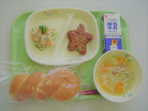 本日のカレーに入っている野菜は、安中産のなすとトマト、玉ねぎ、人参をつかっています。さて、来週から夏休みに入りますね。夏を元気に過ごすための食生活のポイントがあります。その一つに「朝ごはんは必ず食べる」ことがあります。朝ごはんを抜くと、エネルギーや塩分、水分が不足するため、熱中症になりやすくなります。また甘くて冷たいものを摂り過ぎると、食欲が落ち、夏バテの原因にもなります。温かい飲み物や料理を取り入れて、胃腸をいたわりましょう。一学期最後の給食です。冷凍みかんで一学期の給食を締めくくりましょう。