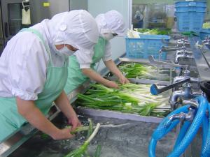 ねぎを洗っています。ねぎは、あじの香味焼きと鶏つみれのすまし汁に入ります。