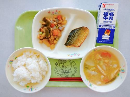 学校給食は明治22年、山形県にあるお寺で、いただいたお米や野菜を使って貧しい家の子に食事を用意したのがはじまりです。今日の給食はそのころの給食を再現し、焼き魚とつけものです。栄養が足りないので牛乳と汁物をつけました。昔は牛乳などなく、栄養も少なくて子どもたちの体はとても小さかったそうです。戦争により給食が中断されましたが、戦後、アメリカやユニセフからの救援物資のおかげで再開されました。日本にも食事が満足に取れない時代がありました。たくさんの人のおかげで給食がつくられ不自由なくいただくことができます。感謝の気持ちを忘れずにいたいですね。