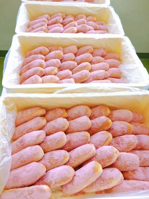 フライヤーでパンをあげ(奥)あげたてパンにいちごシュガーをまぶして(右)パン箱に入れています(左)
