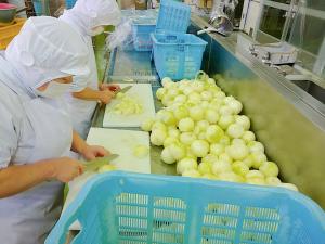 ハヤシライスに使うたまねぎ82kg、奥の機械で皮をむきます